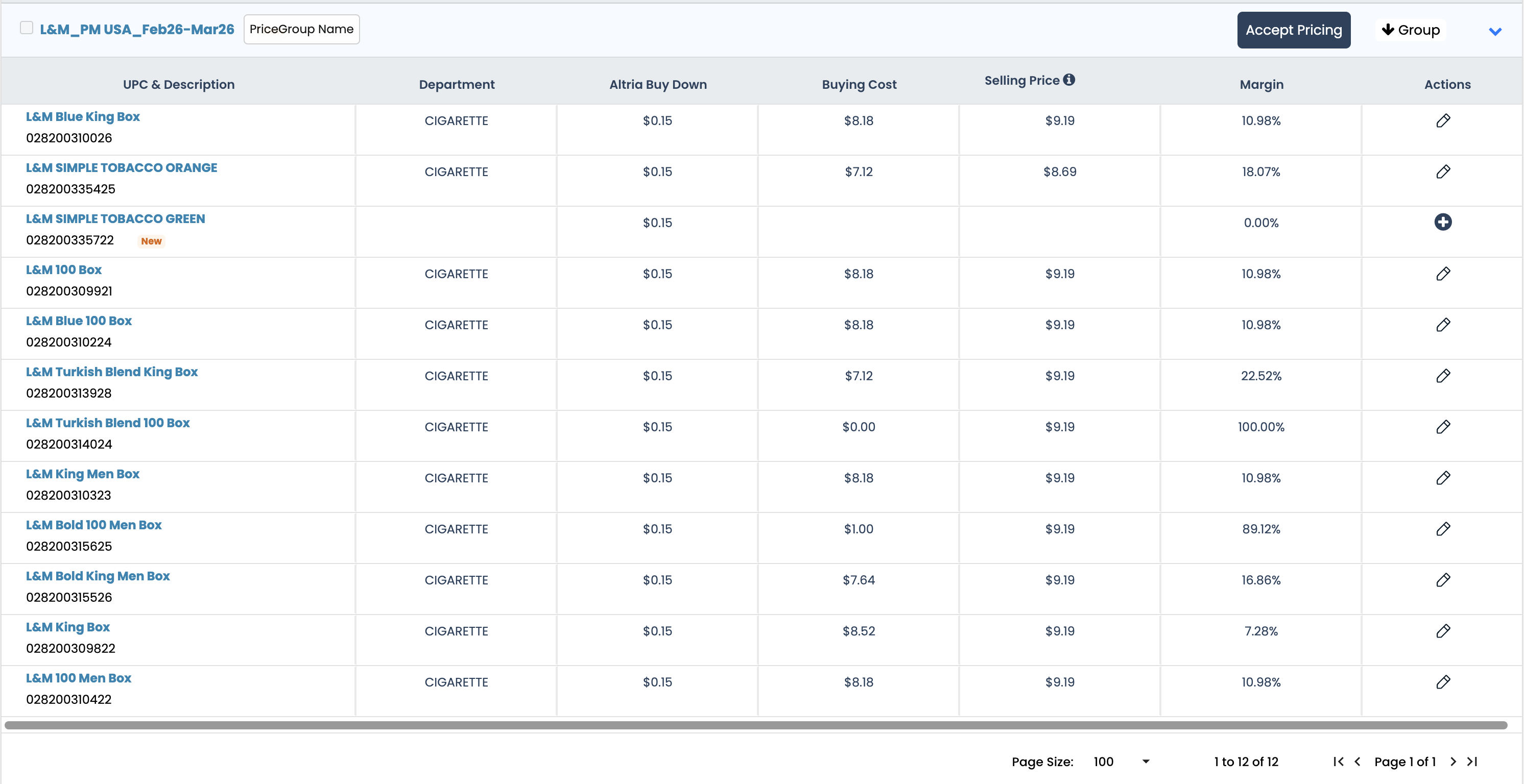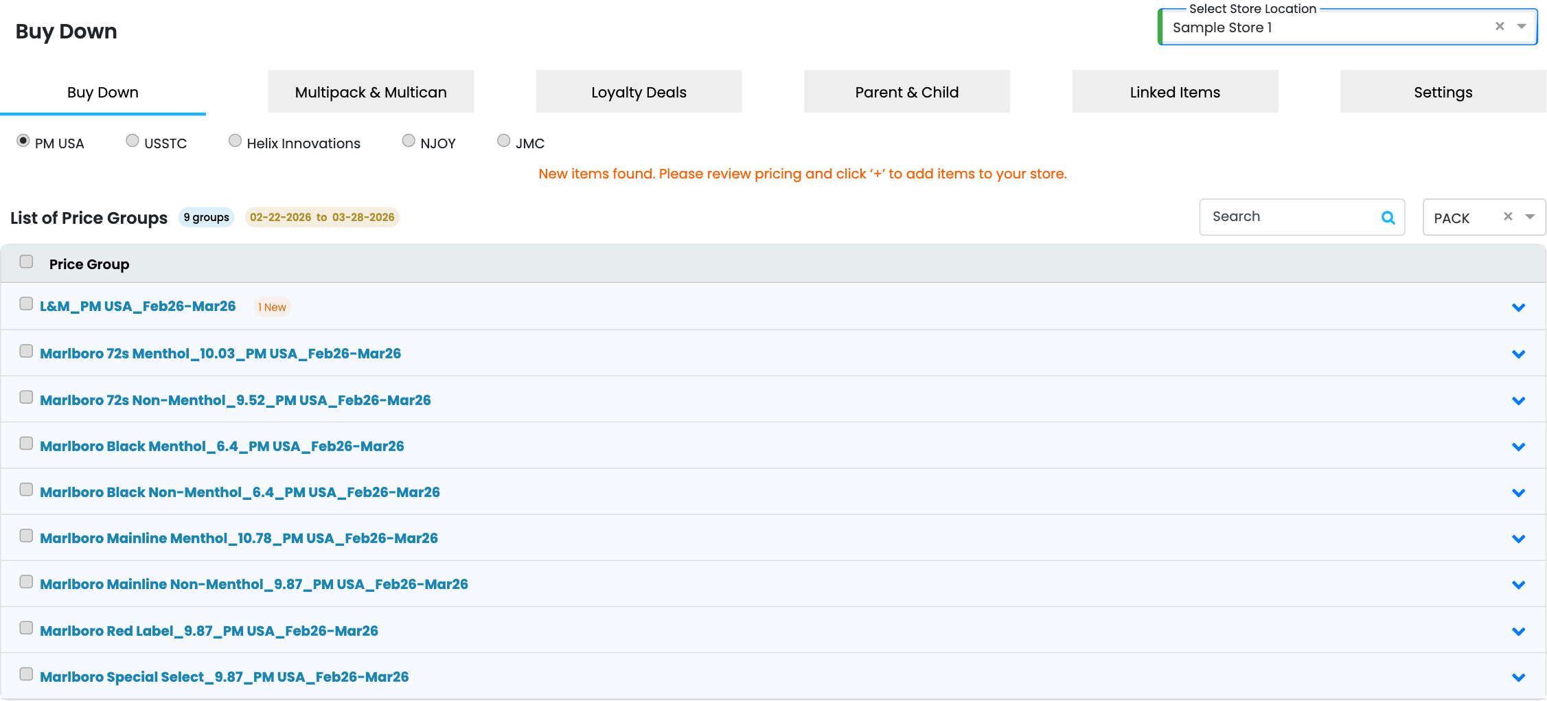 Navigate to: Sidebar → Price Book → Altria Pricing → Select Store → Buy Down tab