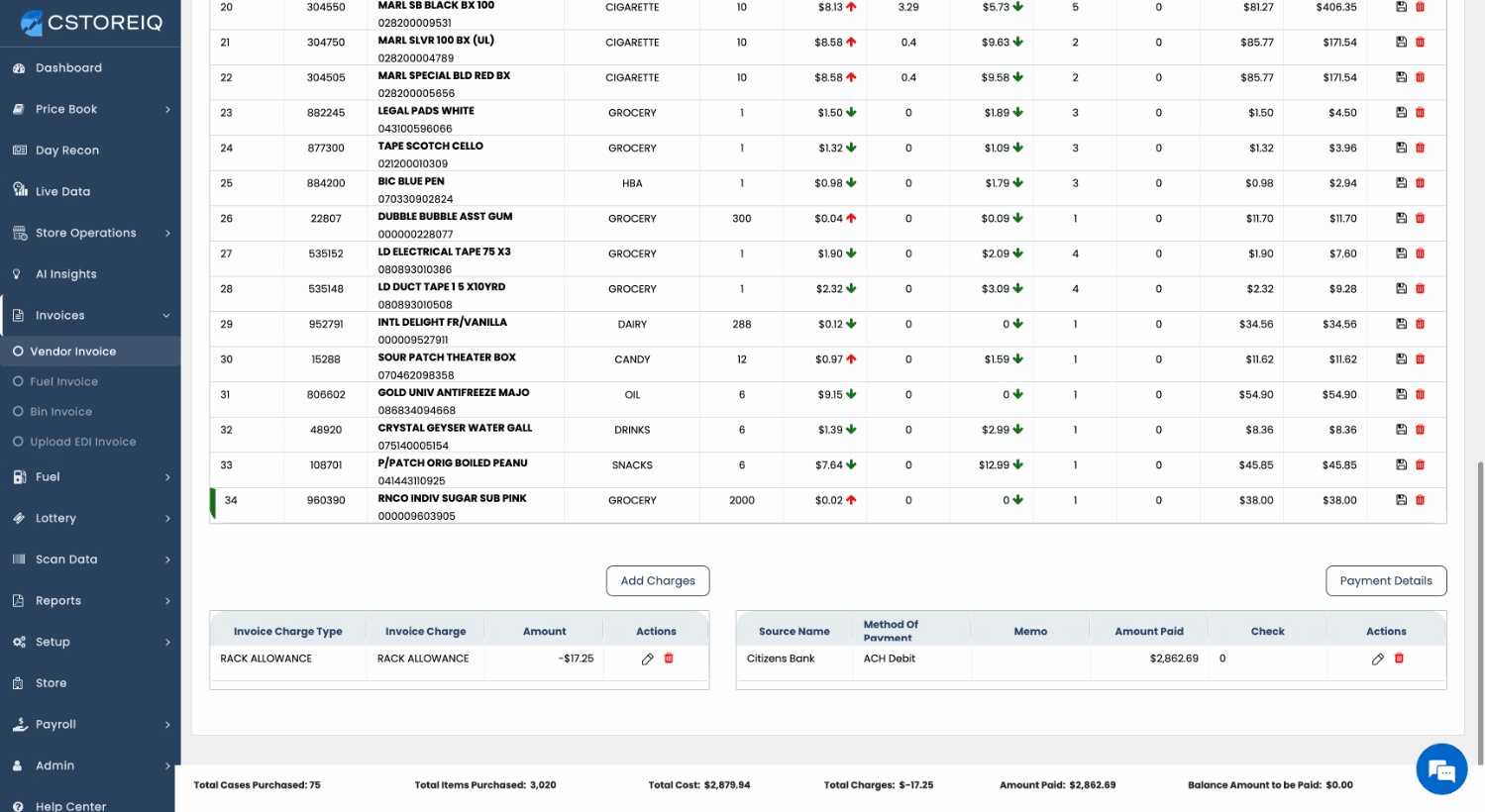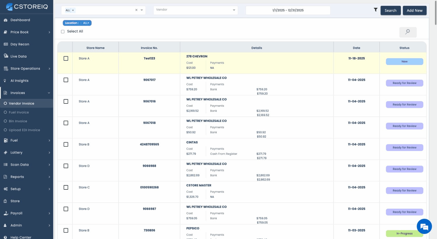 The Vendor Invoice page is the primary hub for managing your store's merchandise invoices. It displays a consolidated list of all invoices — both manually entered and electronically imported — for your selected stores and date range.