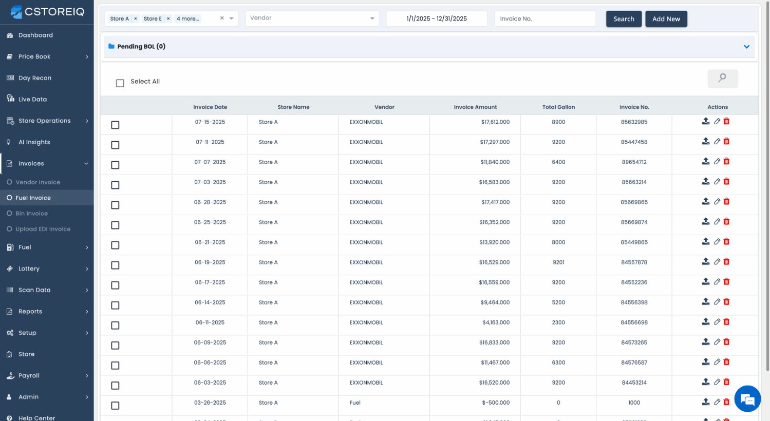 The grid displays fuel invoices with columns: Invoice Date, Store Name, Vendor, Invoice Amount, Total Gallon, Invoice No., and Actions.