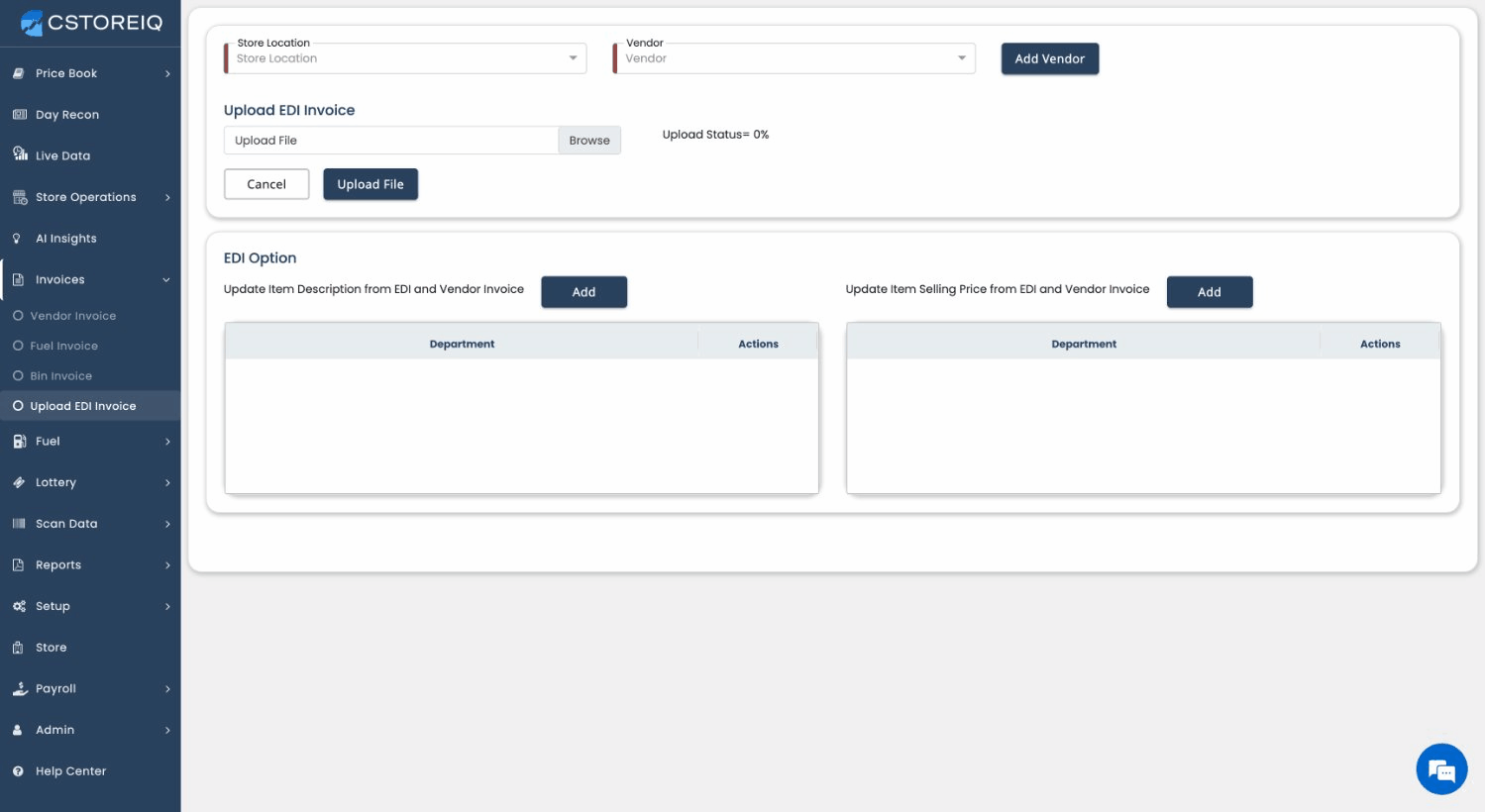 CStoreIQ's Invoice Management module lets you create, view, edit, and manage store invoices — including Electronic Data Interchange (EDI) invoices that are automatically imported from your vendors. The module is organized into three sub-pages accessible from the sidebar.