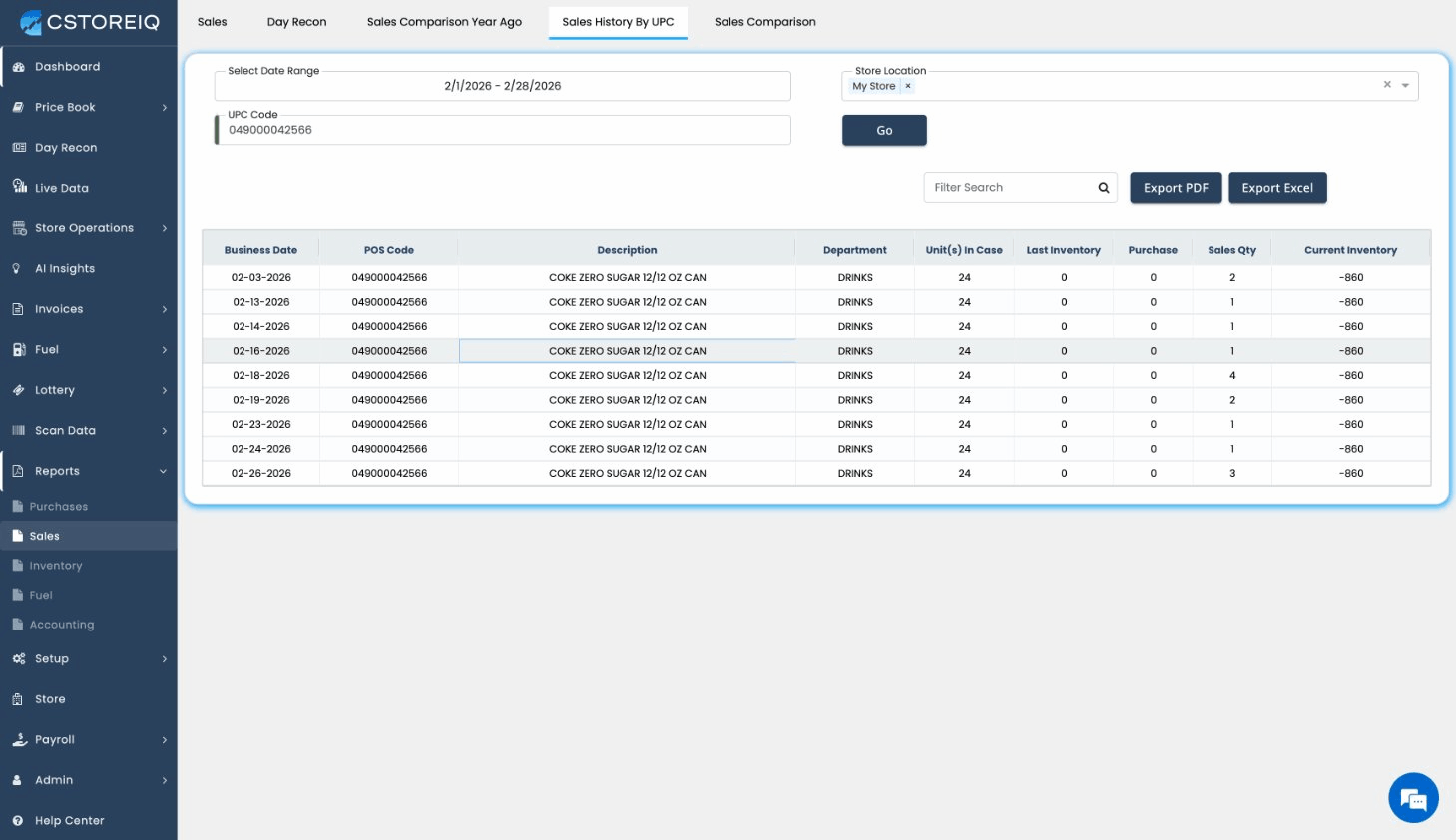 Filters: Date Range, Store Location, UPC Code