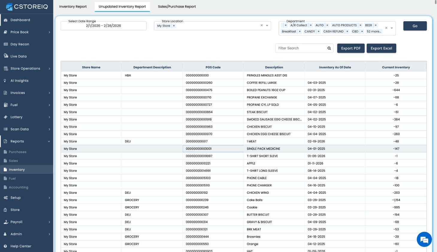 Columns: Store Name, Department Description, POS Code, Description, Inventory As Of Date, Current Inventory.